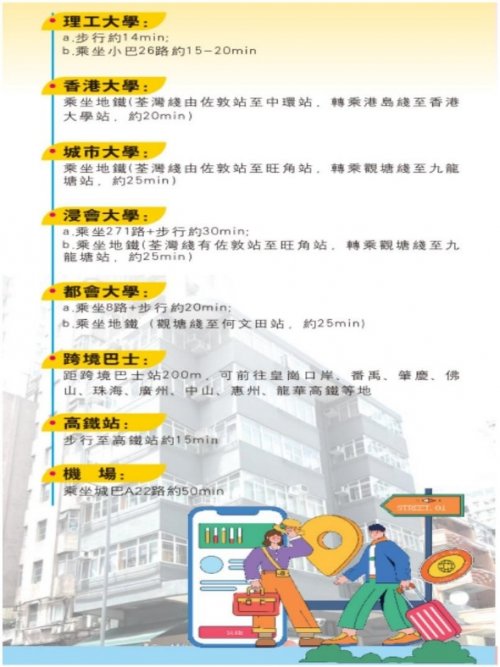 海港公寓占据极佳交通位置:距离佐敦地铁站C2出口仅约100米,地铁出行极其便捷。可轻松步行(约14分钟)或短程小巴直达香港理工大学;前往香港大学、城市大学、浸会大学、都会大学等高等学府均在20-35分钟通勤圈内。