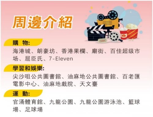 学习休闲: 方便利用尖沙咀公共图书馆、油麻地公共图书馆资源;百老汇电影中心、油麻地戏院及香港天文台提供丰富文化娱乐选择。